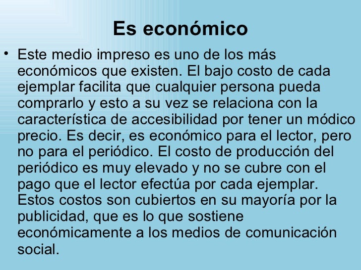 - 10. Es económico Este medio impreso es uno de los más económicos que existen. El bajo costo de cada ejemplar facilita que cualquier persona pueda comprarlo y esto a su vez se relaciona con la característica de accesibilidad por tener un módico precio. Es decir, es económico para el lector, pero no para el periódico. El costo de producción del periódico es muy elevado y no se cubre con el pago que el lector efectúa por cada ejemplar. Estos costos son cubiertos en su mayoría por la publicidad, que es lo que sostiene económicamente a los medios de comunicación social.