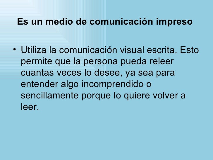 - 2. Es un medio de comunicación impreso Utiliza la comunicación visual escrita. Esto permite que la persona pueda releer cuantas veces lo desee, ya sea para entender algo incomprendido o sencillamente porque lo quiere volver a leer.