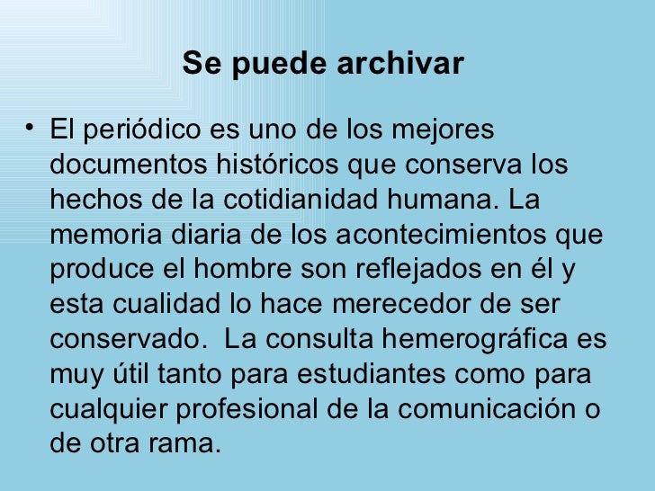 - 3. Se puede archivar <ul><li>El periódico es uno de los mejores documentos históricos que conserva los hechos de la cotidianidad humana. La memoria diaria de los acontecimientos que produce el hombre son reflejados en él y esta cualidad lo hace merecedor de ser conservado. La consulta hemerográfica es muy útil tanto para estudiantes como para cualquier profesional de la comunicación o de otra rama.