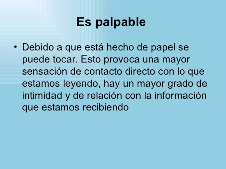 - 4. Es palpable Debido a que está hecho de papel se puede tocar. Esto provoca una mayor sensación de contacto directo con lo que estamos leyendo, hay un mayor grado de intimidad y de relación con la información que estamos recibiendo