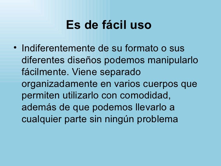 - 5. Es de fácil uso Indiferentemente de su formato o sus diferentes diseños podemos manipularlo fácilmente. Viene separado organizadamente en varios cuerpos que permiten utilizarlo con comodidad, además de que podemos llevarlo a cualquier parte sin ningún problema </li></ul>