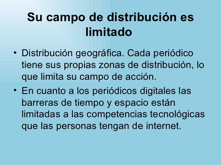 - 6. Su campo de distribución es limitado Distribución geográfica. Cada periódico tiene sus propias zonas de distribución, lo que limita su campo de acción. En cuanto a los periódicos digitales las barreras de tiempo y espacio están limitadas a las competencias tecnológicas que las personas tengan de internet.