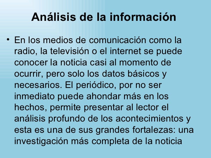 - 7. Análisis de la información En los medios de comunicación como la radio, la televisión o el internet se puede conocer la noticia casi al momento de ocurrir, pero solo los datos básicos y necesarios. El periódico, por no ser inmediato puede ahondar más en los hechos, permite presentar al lector el análisis profundo de los acontecimientos y esta es una de sus grandes fortalezas: una investigación más completa de la noticia