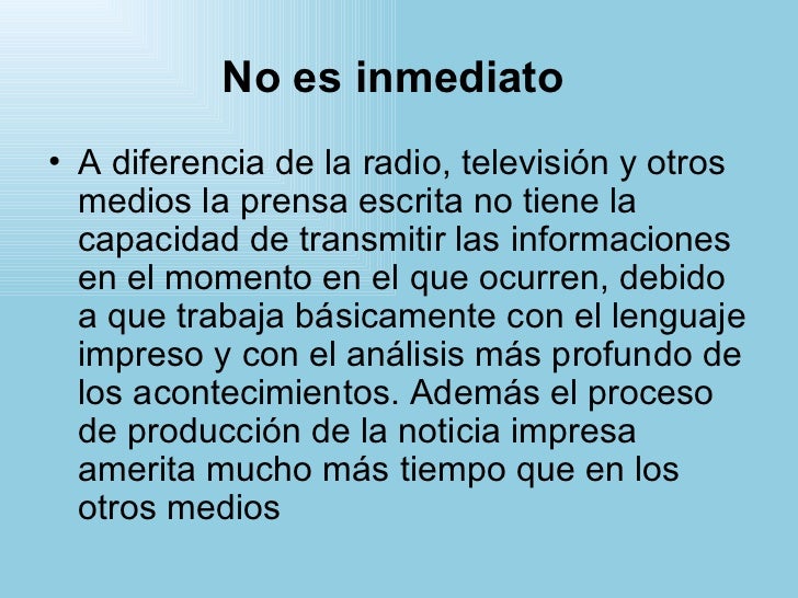 - 8. No es inmediato A diferencia de la radio, televisión y otros medios la prensa escrita no tiene la capacidad de transmitir las informaciones en el momento en el que ocurren, debido a que trabaja básicamente con el lenguaje impreso y con el análisis más profundo de los acontecimientos. Además el proceso de producción de la noticia impresa amerita mucho más tiempo que en los otros medios