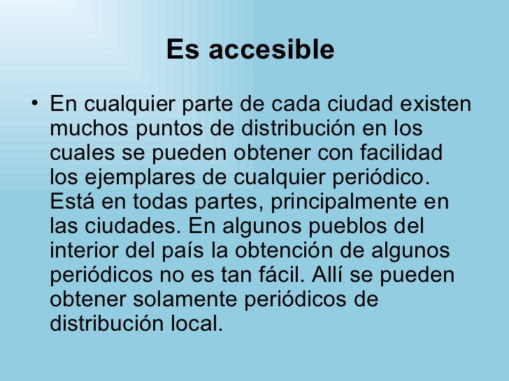 - 9. Es accesible En cualquier parte de cada ciudad existen muchos puntos de distribución en los cuales se pueden obtener con facilidad los ejemplares de cualquier periódico. Está en todas partes, principalmente en las ciudades. En algunos pueblos del interior del país la obtención de algunos periódicos no es tan fácil. Allí se pueden obtener solamente periódicos de distribución local.